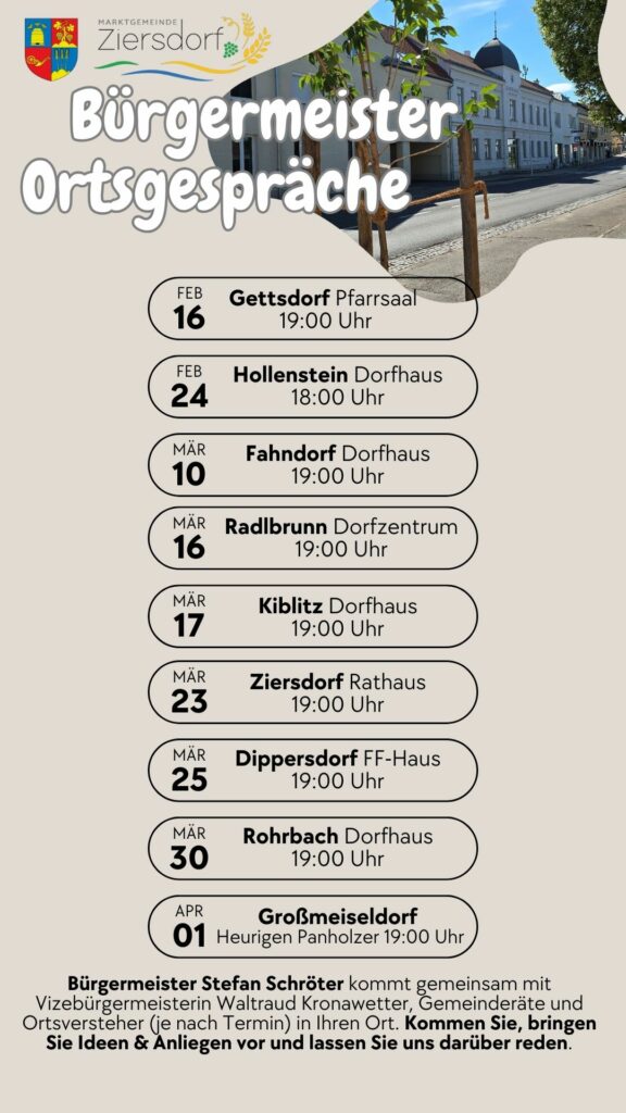 Sie haben Anliegen, Wünsche oder Ideen für Ihren Ort? Die Ortsgespräche sind die perfekte Gelegenheit, diese direkt anzusprechen. Eine Anmeldung ist nicht erforderlich. Wir freuen uns auf Ihren Besuch! 🤝✨