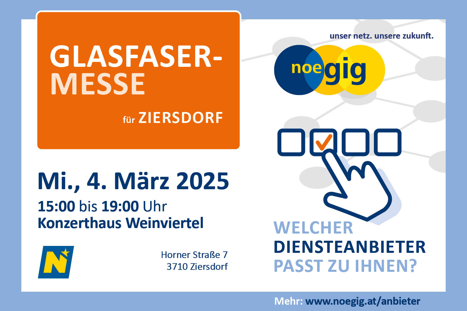 Um Ihnen die Entscheidung zu erleichtern, laden wir Sie herzlich zur zweiten Glasfasermesse für Ziersdorf ein. Dort können Sie sich im Detail informieren und von den Diensteanbietern direkt beraten lassen. Hier finden Sie die aktuellen Informationen: www.noegig.at/anbieter.